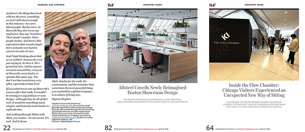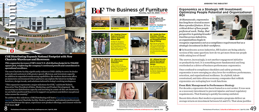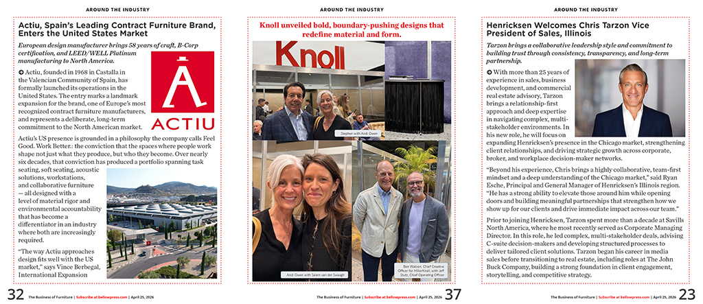 •   INDUSTRY PULSE & FIRST LOOKS - Allseating Announces Partnership With Crane Reps LLC / Configura Grows Ecosystem with roster of New Manufacturers in Q1 2026 / Humanscale to Host Dr. Alan Hedge on May 12 for Live NYC Event on the Science of Sitting, Seating Design, and Workplace Wellness / Mohawk Group Acquires Hero Flooring / McLain Group Unveils a Rebrand Built on Legacy, People, and What Comes Next / Design at Work: Media 10 Announces Launch of a New Dedicated Workspace Design Fair for the U.S. Market for 2027 / Sunon Showcases Smart and Sustainable Workplace Solutions at CIFF Guangzhou 2026 / A Showcase of Launches and Classics for Emuamericas at HD Expo 2026