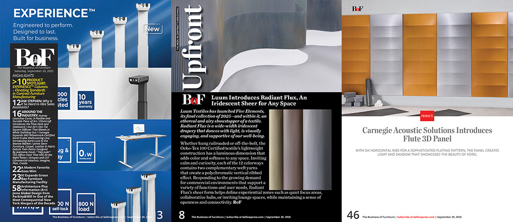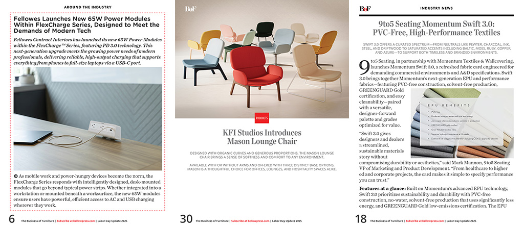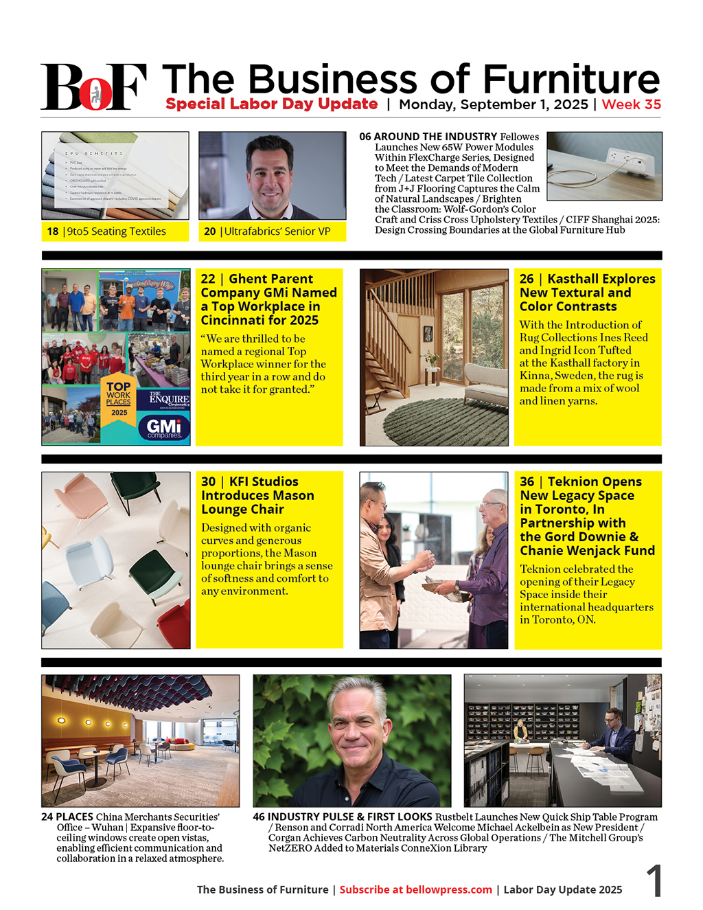 New publications about predicting change, not just watching it / Deb Bailey: Take nothing for granted / Sales' love-hate relationship with technology / Finding Talent Requires Strategy / Stephen Says / Ten "S" (teps) Toward the "OotF" / Losing Control of Your Brand / Stop Poaching my Employees! / Develop Your Most Important Asset: Your People / Ergonomics Faces Future With More Handhelds, Fewer Desks / Sales vs Marketing? The Internet has Changed that Relationship Forever / JRB Studio completes the design circle / In2Design's experience benefits growing customer base / West Elm Workspace takes industry by storm / The future of coworking / National learns from its own new HQ experience / DWR's dynamic duo:Edelman & McPhee / FluidStance is on the Level (and hopes you are too) / Tech startup PointDrive picks furniture close to home / Folkert Goes Big, Goes Bold / Industry Can Learn From The Coworking Movement / AV can add to a Dealer's Bottom Line / Where's Your ShowroomR? Everywhere / Group Dekko: Supplier to Budding Tech Company / Emory University connects with Backbone / HDR Chicago / IDEO has joined the creative kyu collective, a unit of Tokyo-based Hakuhodo DY Holdings / Studio Wise Uses Expertise in Specials to Create New Lines / Reflections on Groupe Lacasse turning 60 from its CEO / MOI Moves to New D.C. NoMa Showroom / idesk, Cherryman make a Splash on Silicon Beach in L.A. / Stir unveils new Product / The Backlash Against Collaboration / Melissa Price Helps Detroit Pop / Artopex showrooms / PWV Takes Carpets to New (Corporate) Levels / Dauphin Retools for the North American Market / History is Important but OM is Ready for the Next 30 Years /